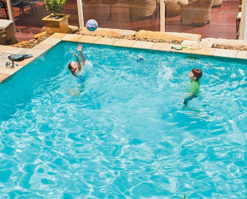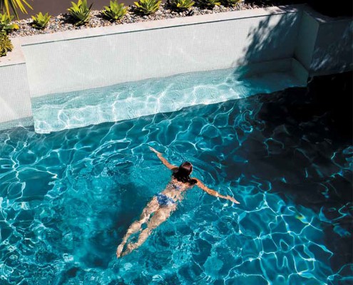 Pools that are located under an open sky can take full advantage of light reflections, to create a richer, ‘bluer’ tint to the pool water. While pools that are surroundedwith tall trees and shrubs, produce darker shades due to shadows that are cast. Tile bands and the depth of the pool also influence the final colour of your pool.